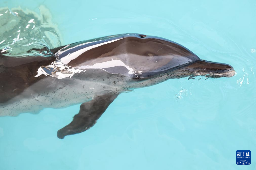 2025年9月8日,海豚“万万”在海南陵水的救助池中游动。