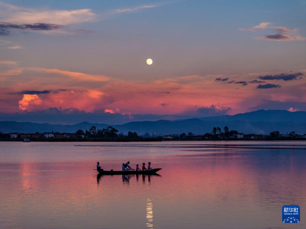 2025年10月6日,人们乘船在云南大理洱源西湖赏月(无人机照片)。