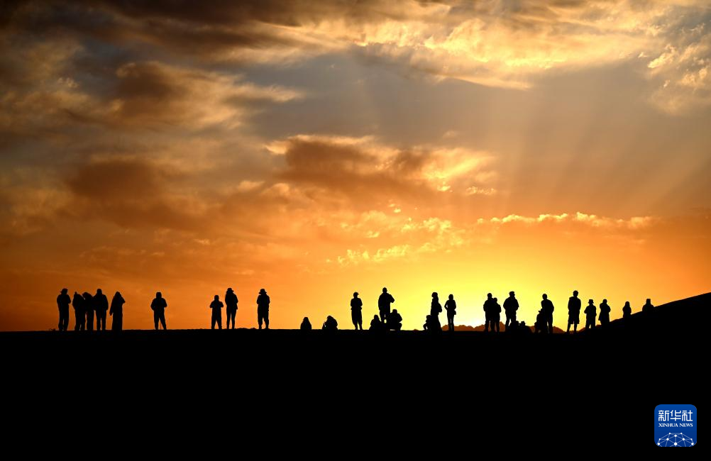 2025年10月2日清晨,游客在甘肃省敦煌市鸣沙山月牙泉景区观赏大漠日出美景。