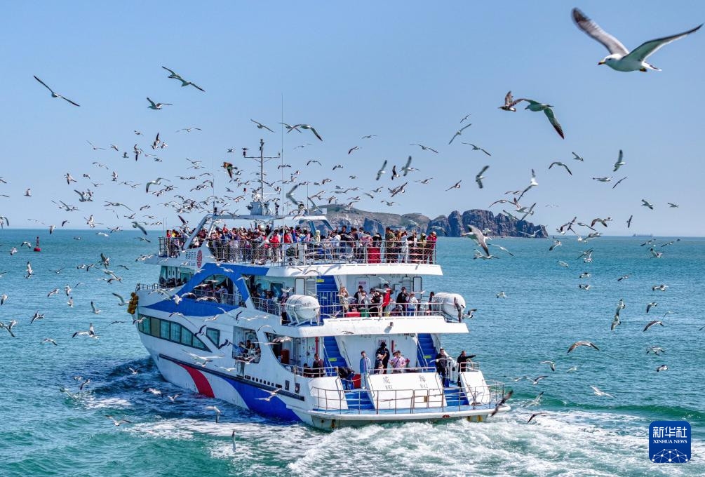 2025年5月4日,在山东省荣成市海驴岛海域,游客乘坐海驴岛环岛游专线与黑尾鸥互动(无人机照片)。