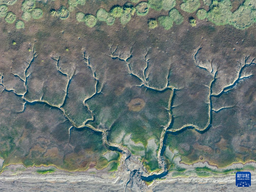 2025年10月11日在浙江嘉兴海宁拍摄的钱塘江退潮后的“潮汐树”(无人机照片)。