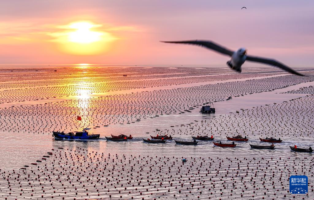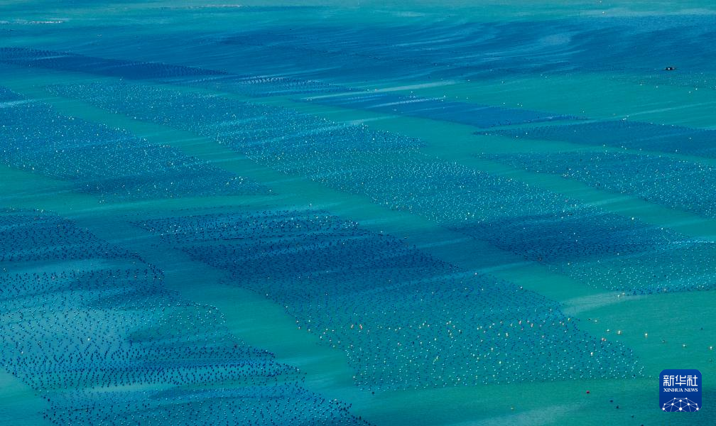 2025年7月3日,在福建省福州市连江县黄岐半岛海域海洋牧场里,海面波光粼粼,光影下的浮球层层叠叠,织就一幅美丽画卷(无人机照片)。