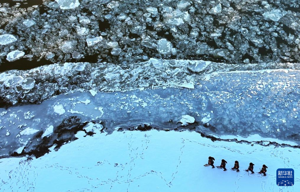 2025年10月30日,黑龙江出入境边防检查总站黑河边境管理支队花园边境派出所民警在“跑冰排”的黑龙江黑河段江岸边巡逻(无人机照片)。
