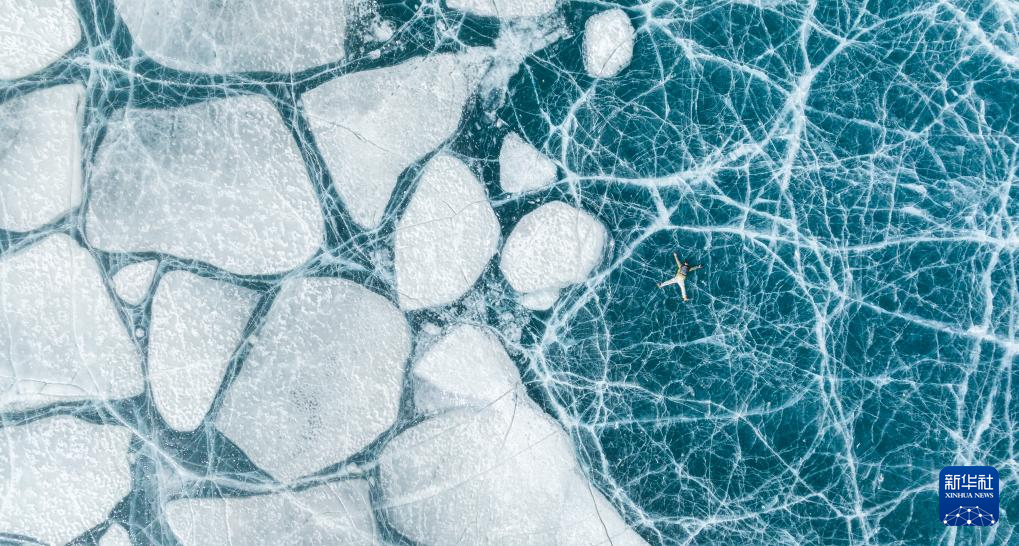 2025年1月26日,一名游客躺在西藏山南浪卡子县恰央错结冰的湖面上拍照(无人机照片)。