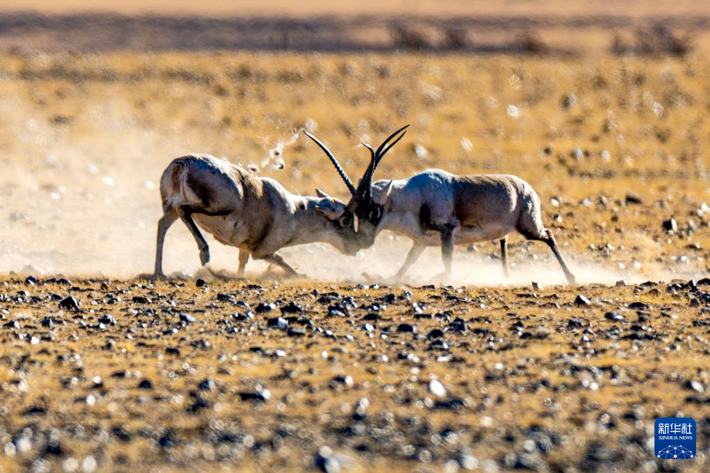 2025年12月3日,两头雄性藏羚羊在西藏羌塘国家级自然保护区的草原上打斗,争夺交配权。