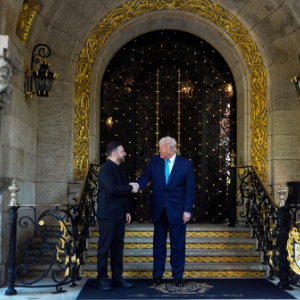 12月28日下午,美国总统特朗普在美国佛罗里达州海湖庄园同乌克兰总统泽连斯基举行会晤。这是特朗普在海湖庄园门口迎接泽连斯基。新华社/美联