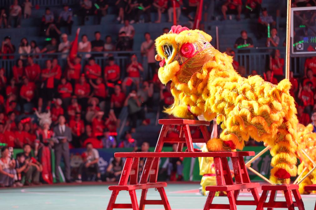 ↑11月11日,粤港澳联队在第十五届全国运动会群众展演舞龙舞狮南狮自选项目决赛中获得一等奖。 新华社记者 王鹏 摄