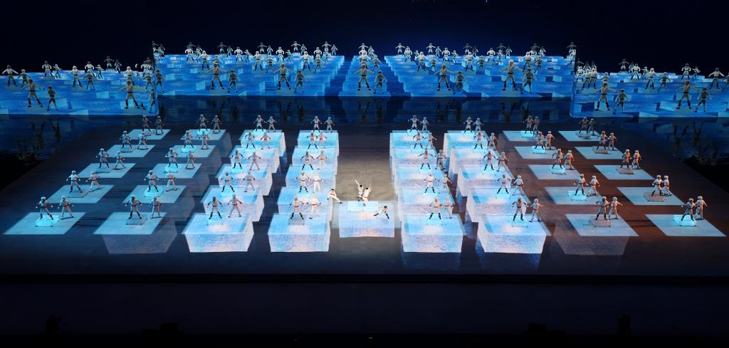 ↑2月7日,演员在开幕式上表演。当日,第九届亚洲冬季运动会开幕式在哈尔滨举行。新华社记者 陈益宸 摄