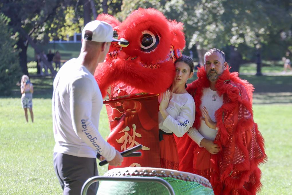 ↑9月21日,在匈牙利首都布达佩斯,匈牙利舞狮协会主席、禅武联盟副主席桑多尔·米凯斯(左)指导舞狮表演,16岁的高中女生劳拉·萨拉蒙(中)和搭档认真聆听。新华社发(弗尔季·奥蒂洛摄)