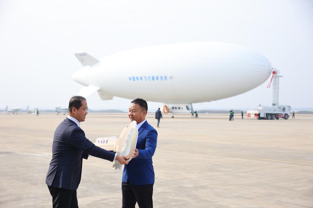 图为国产AS700载人飞艇批产首艇交付,太仓文旅集团取得“启航钥匙”。(受访单位供图)