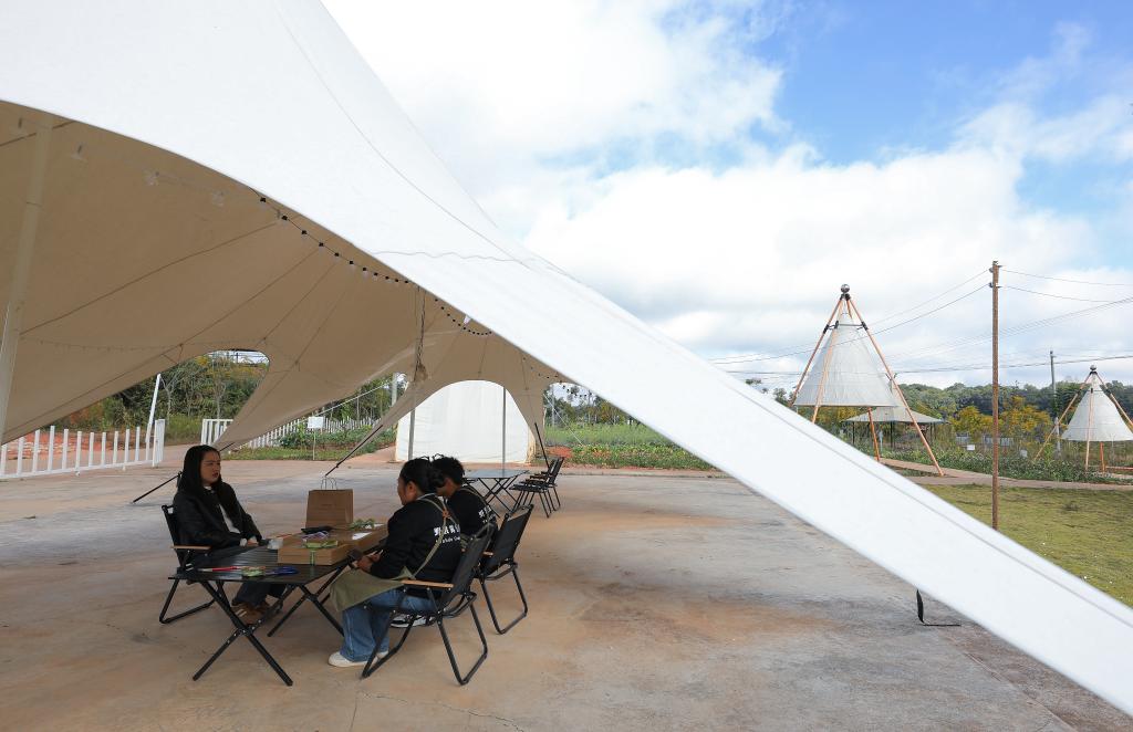 魏春(前)和工作人员在大渡岗乡大干坝村的露营地为顾客端上精心包装的烧烤食材。