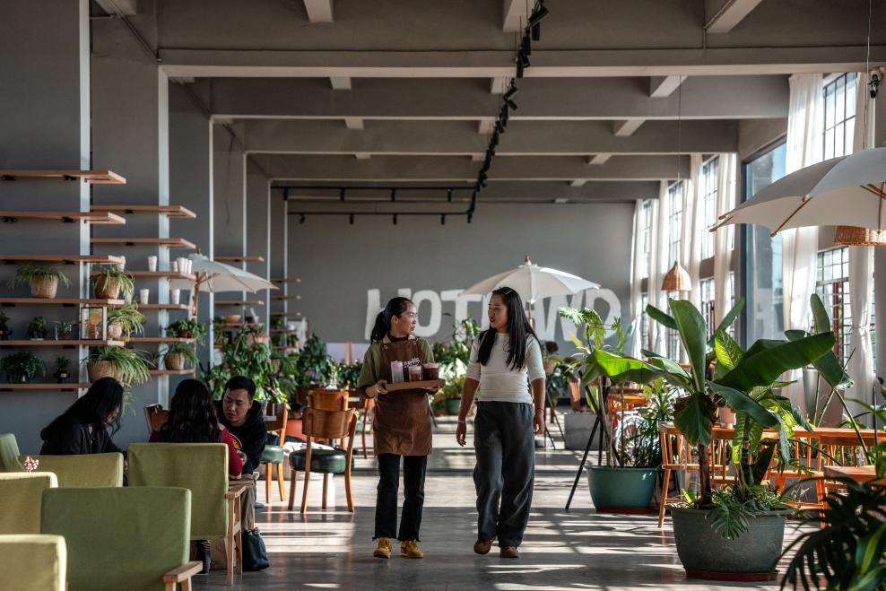 游客在大渡岗乡“热土工作室”品饮咖啡、打卡拍照。