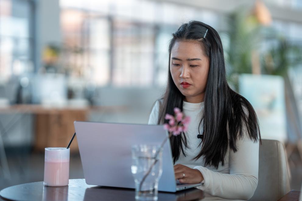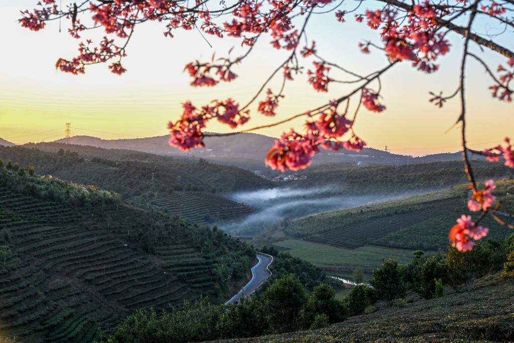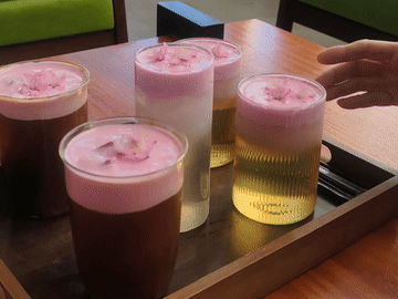 游客在大渡岗乡“热土工作室”品尝当地村民制作的樱花主题茶饮和咖啡。