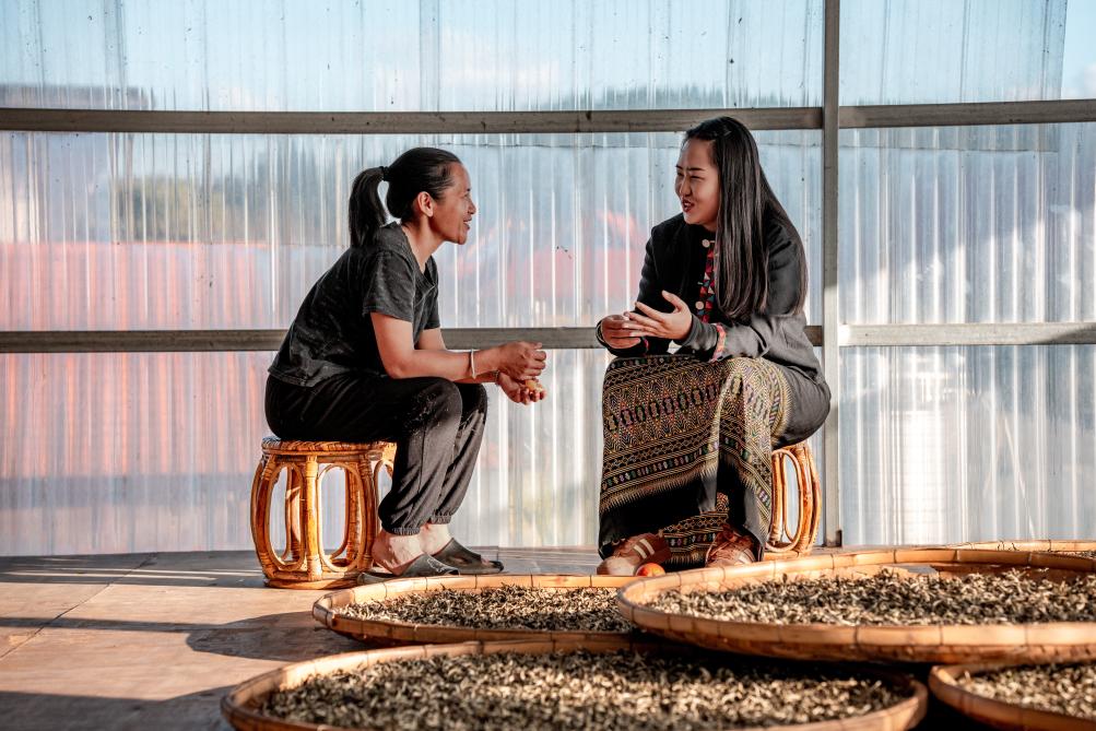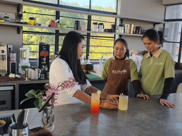 魏春(左)在大渡岗乡“热土工作室”培训员工调制茶饮。