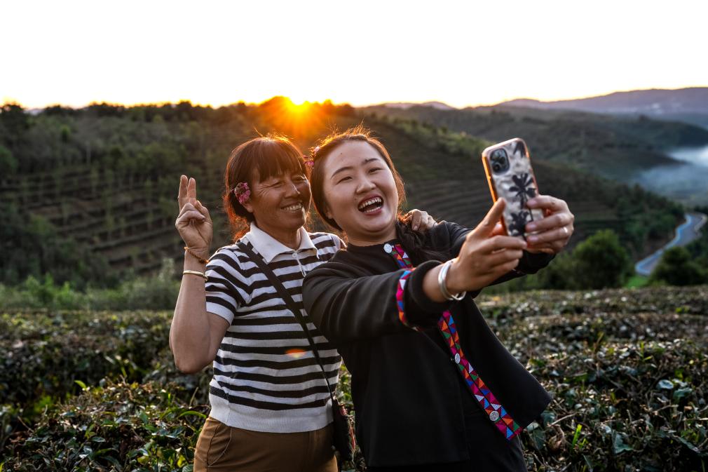 魏春(右)和母亲在大渡岗乡的茶园里自拍。