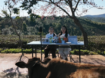 魏春(右)和大渡岗乡党委书记王旭君在茶园旁直播推介乡村美景与特色商品。