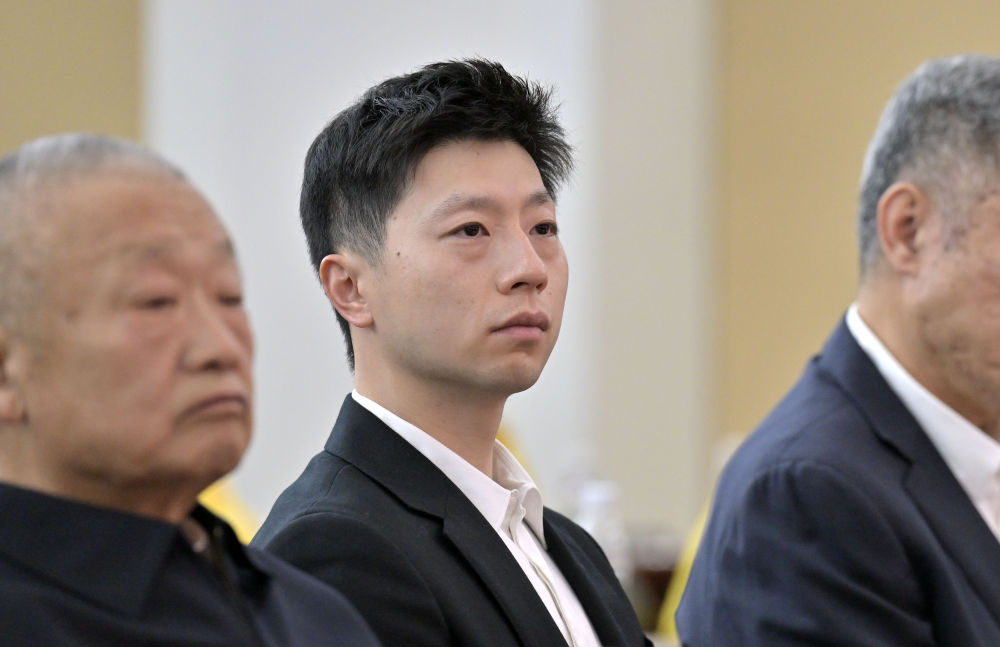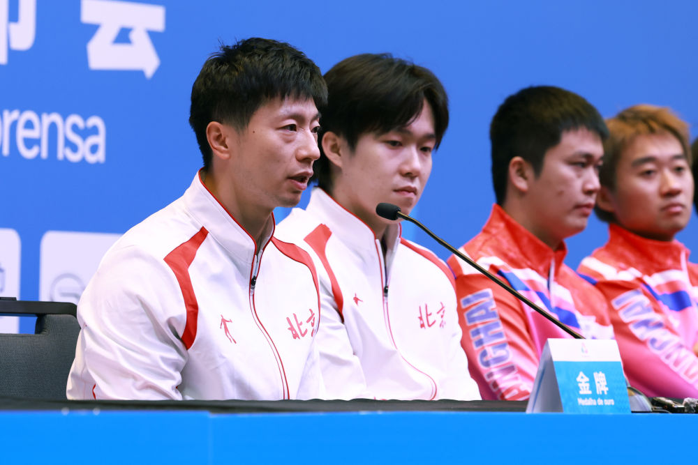 ↑11月20日,北京队选手马龙(左一)在第十五届全国运动会乒乓球男子团体金牌赛后发布会上发言。