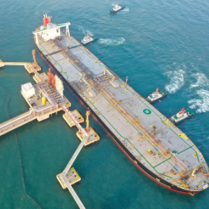 2025年12月18日,一艘装载着17.9万吨石化原辅料的船舶泊入国投洋浦油储码头30万吨级原油泊位(无人机照片)。新华社记者 郭程 摄
