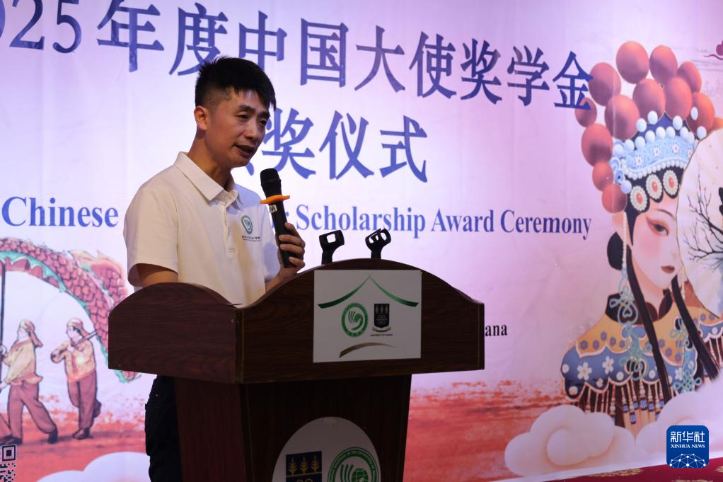 12月30日,在加纳首都阿克拉,加纳大学孔子学院负责人蔡彬彬在2025年“中国大使奖学金”颁奖仪式上讲话。新华社记者 高剑飞 摄