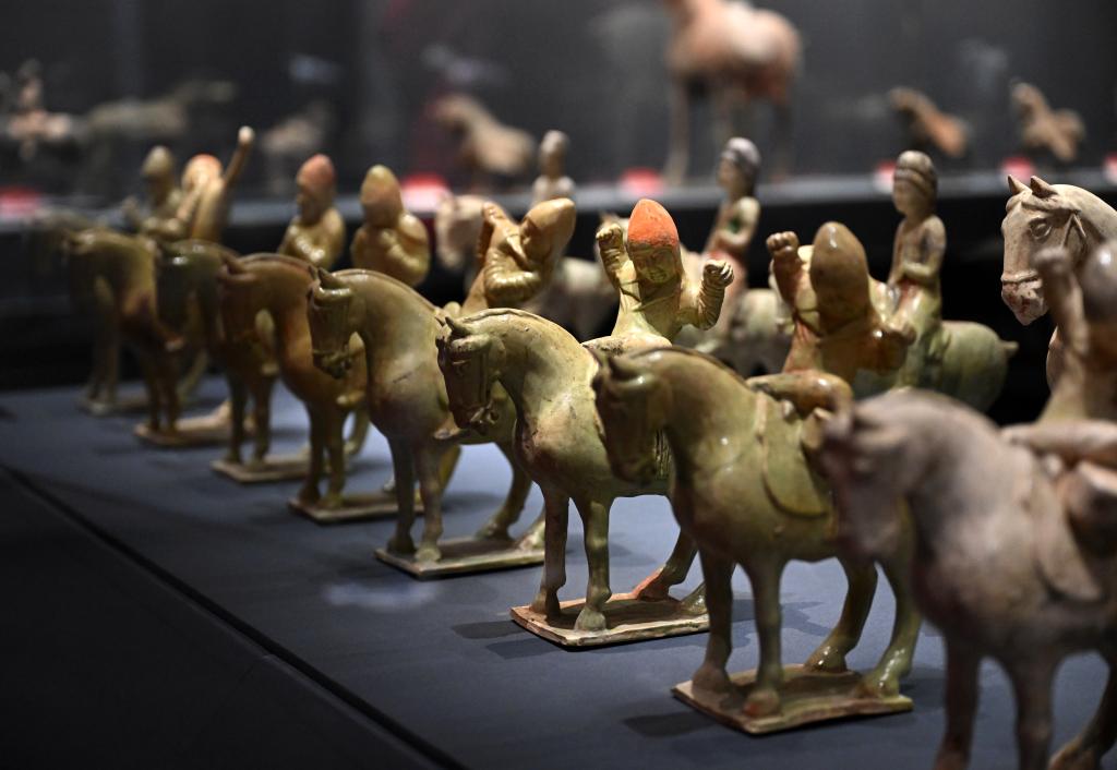 1月1日,这是此次展出的唐代青釉彩绘伎乐骑马俑。新华社记者 李嘉南 摄