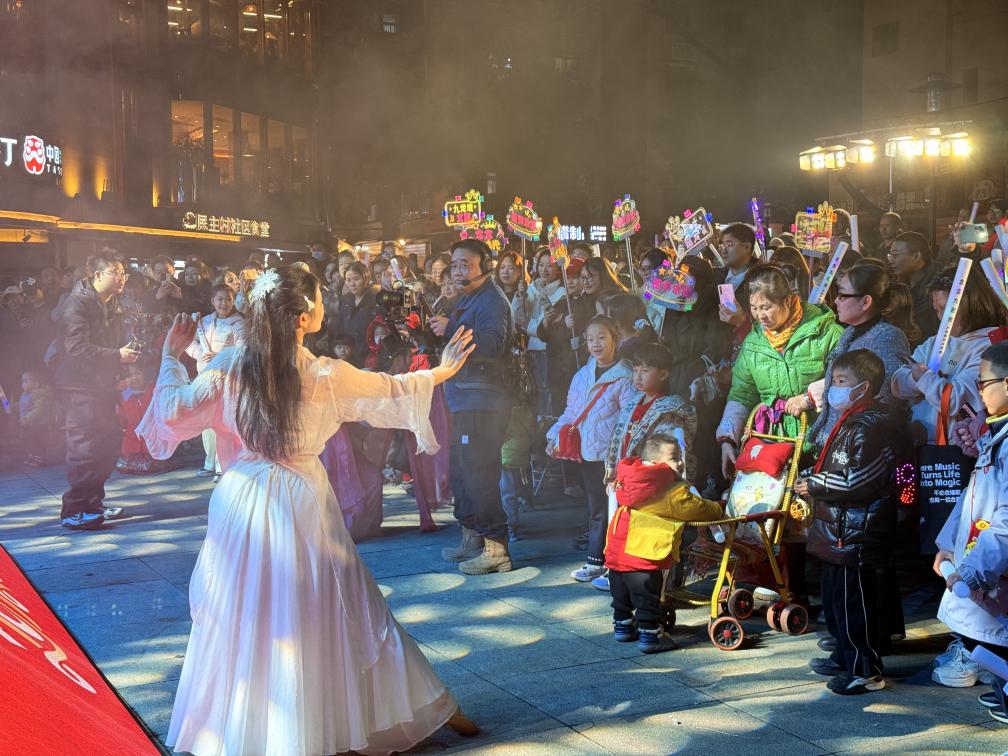 真正开场时,舞台彻底融入了社区的夜晚。66岁的朱珠阿姨被老伴从家里“拽”来,此刻正举着荧光棒跟唱《最炫民族风》。“这种演出形式太好了!走出家门口就能看到,又热闹又喜庆,很有节日氛围。”朱珠的手机镜头环拍全场,画面里不时闪过邻居们的笑脸。