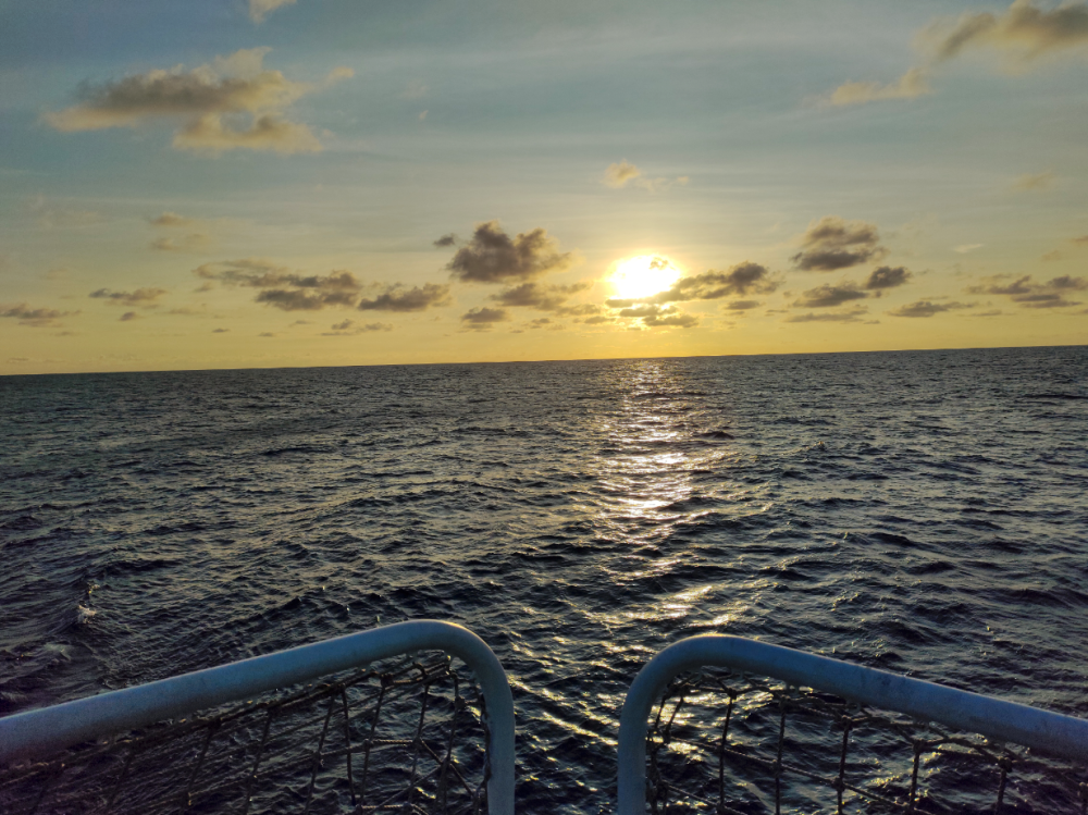 1月1日,在中国南沙仙宾礁附近海域,海警浮鹰舰迎接新年的日出。新华社记者陆钰摄