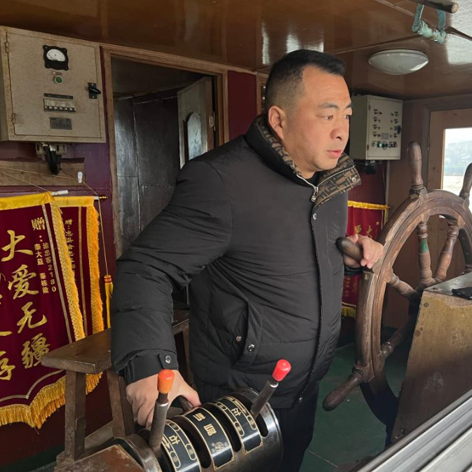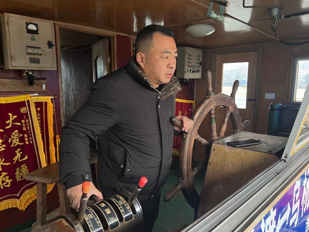 秦大益稳稳转动船舵,客轮在江面上踏浪而行。他的爷爷和爸爸都是船长,他18岁开始掌舵,2026年是第30个年头。
