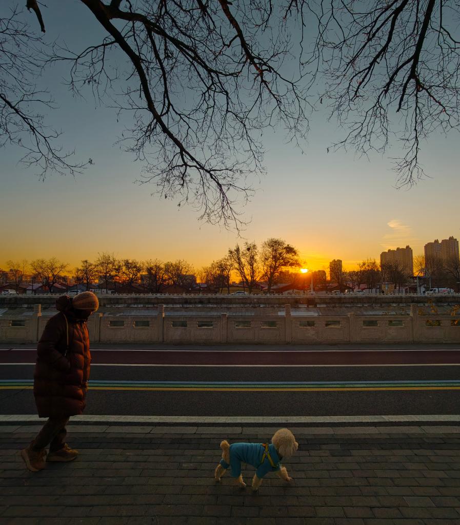 1月1日,日出时分,市民在河北沧州大运河边遛狗。摄影:张海军