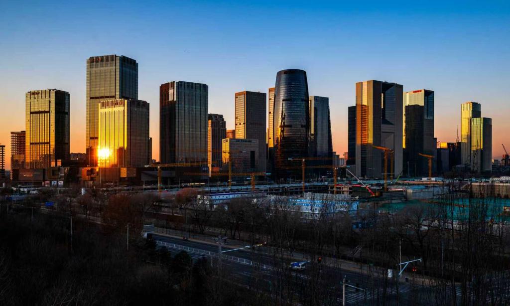 1月1日,日出时分的阳光照在北京丽泽商务区大楼的外立面上。摄影:陈益宸