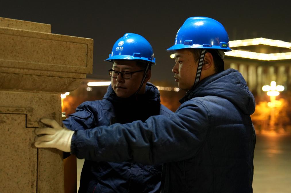 华灯班夜班小组长刘泉水(左一)和组员尤峥(右一)在天安门广场上进行华灯巡检工作。新华社记者马晓冬摄