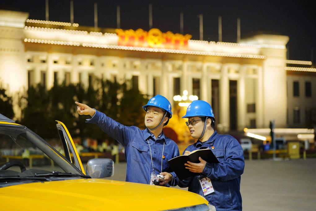 华灯班班长陈春光(左一)和工作人员正在天安门广场巡检华灯。新华社发(张超摄)