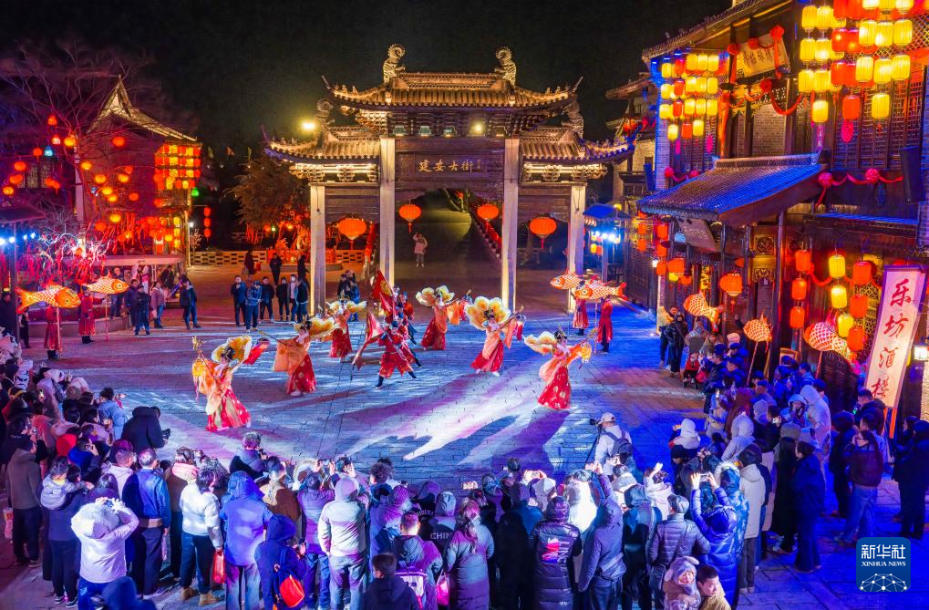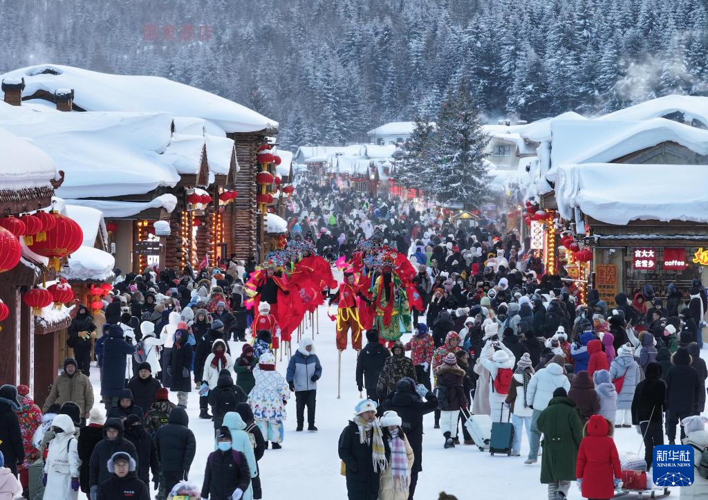 1月1日,游客在位于黑龙江省牡丹江市的“中国雪乡”景区雪韵大街上欣赏踩高跷表演(无人机照片)。
