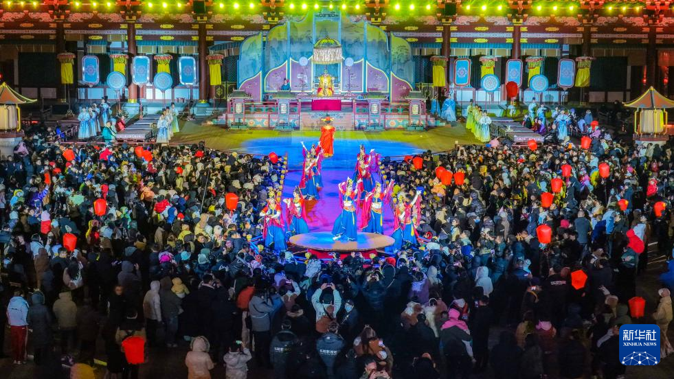 1月1日,游客在山东乐陵影视城景区观看表演(无人机照片)。