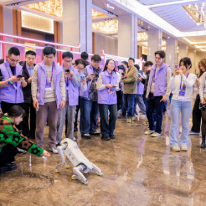 2025年12月31日,苏州“OPC之夜”活动现场,高校学生与机器狗互动。(受访者供图)