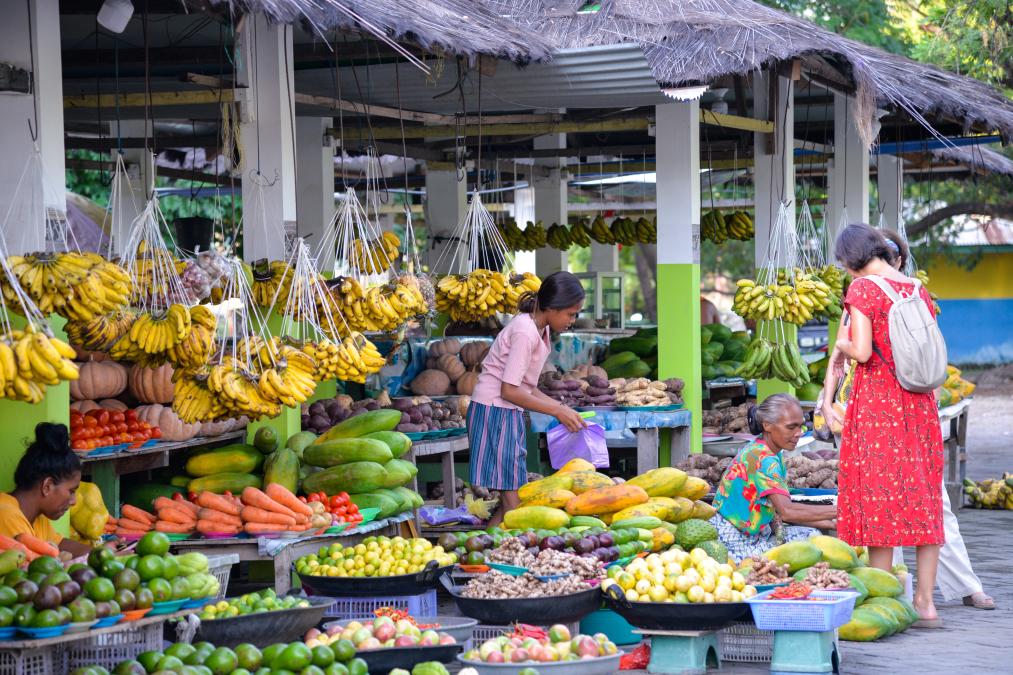 2022年6月4日,在东帝汶首都帝力,人们在一家水果市场购买水果。新华社记者徐钦摄