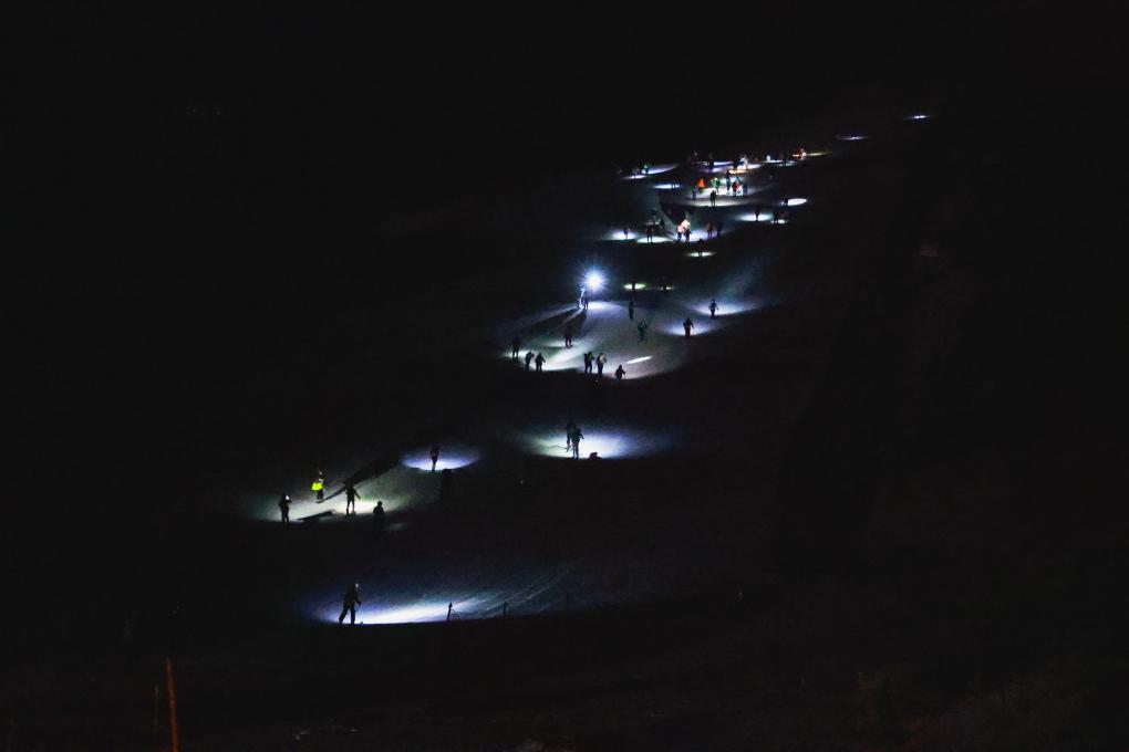 ↑2026年1月1日,第二届北京滑雪登山公开赛选手在国家高山滑雪中心雪道上攀登