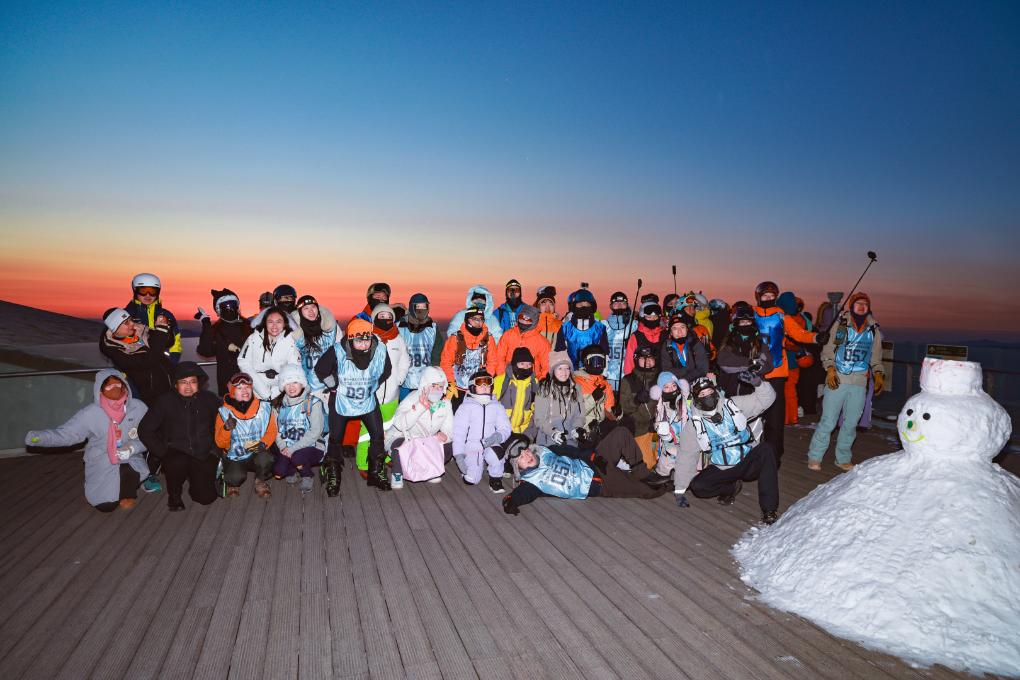 ↑第二届北京滑雪登山公开赛选手在登顶后与2026年第一缕朝霞合影