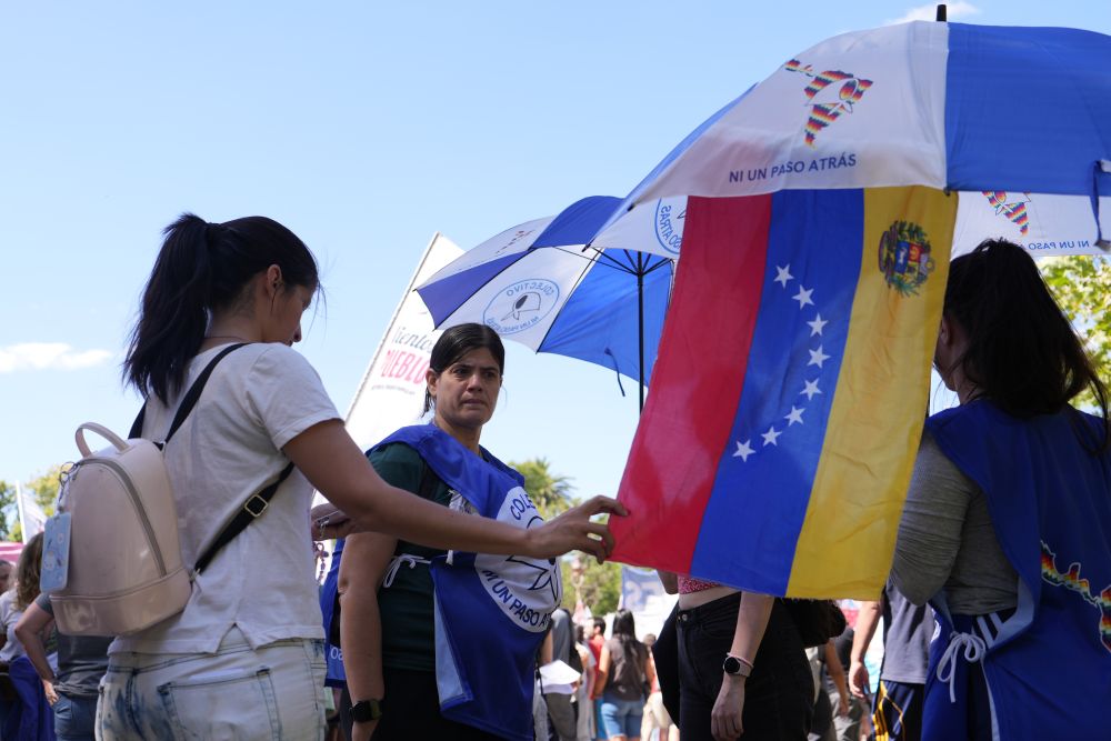 ↑↓1月3日,在阿根廷首都布宜诺斯艾利斯的美国驻阿根廷大使馆附近,当地民众挥舞委内瑞拉国旗参加抗议美国干涉的集会。