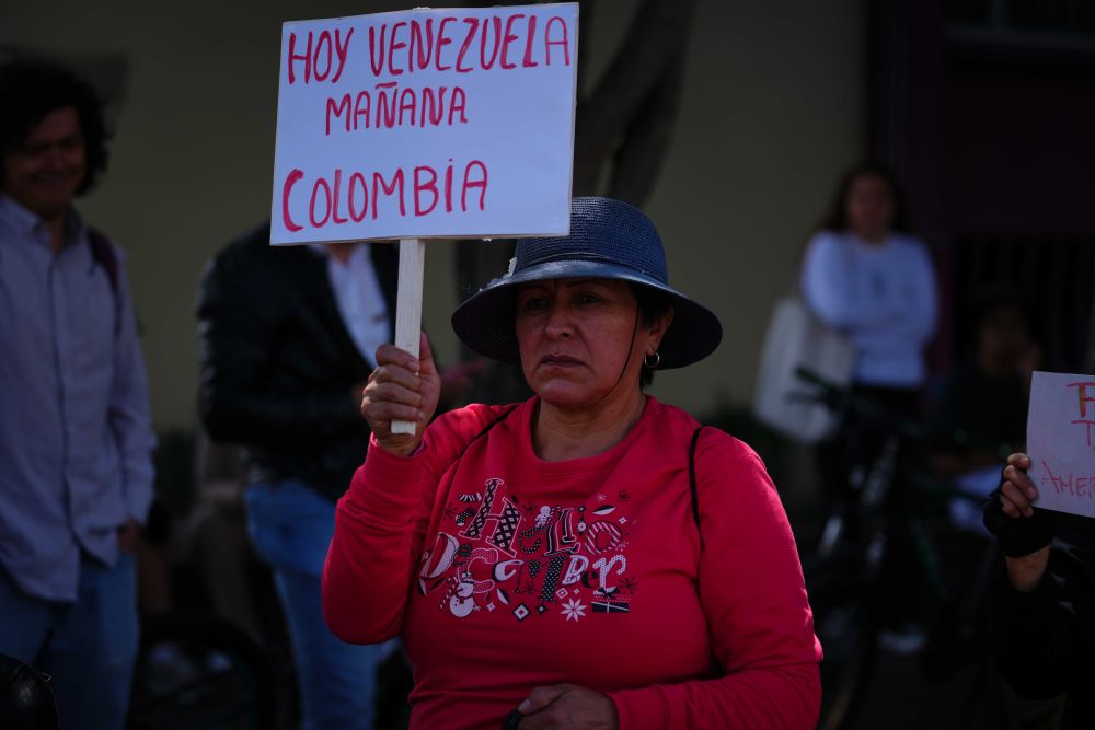 1月3日,在哥伦比亚首都波哥大的美国驻哥伦比亚大使馆外,一名妇女手举写有“今天委内瑞拉,明天哥伦比亚”的标语,表达对委内瑞拉总统马杜罗的支持。