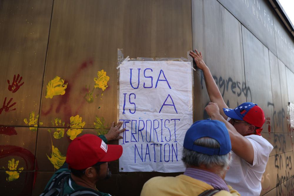 1月3日,在墨西哥首都墨西哥城,民众在美国驻墨西哥大使馆外墙上贴出标语“美国是恐怖主义国家”。