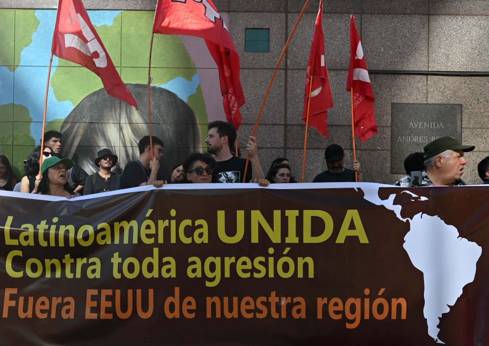 1月3日,智利民众在首都圣地亚哥的美国大使馆外举行集会,标语牌上写着“拉美团结反对侵略美国从拉美地区出去”。