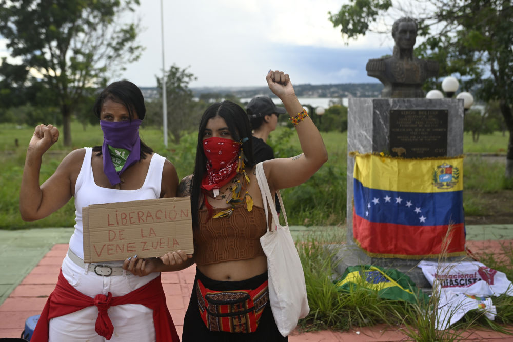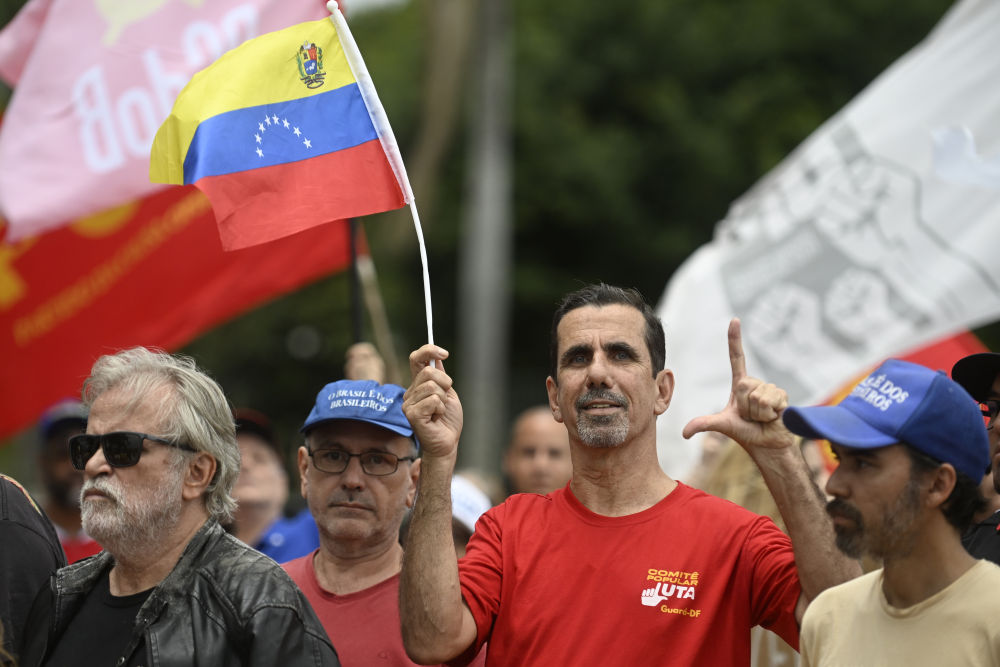 1月3日,巴西民众在首都巴西利亚的玻利瓦尔纪念碑前抗议美国的军事行动,标语牌上写着“解放委内瑞拉”。