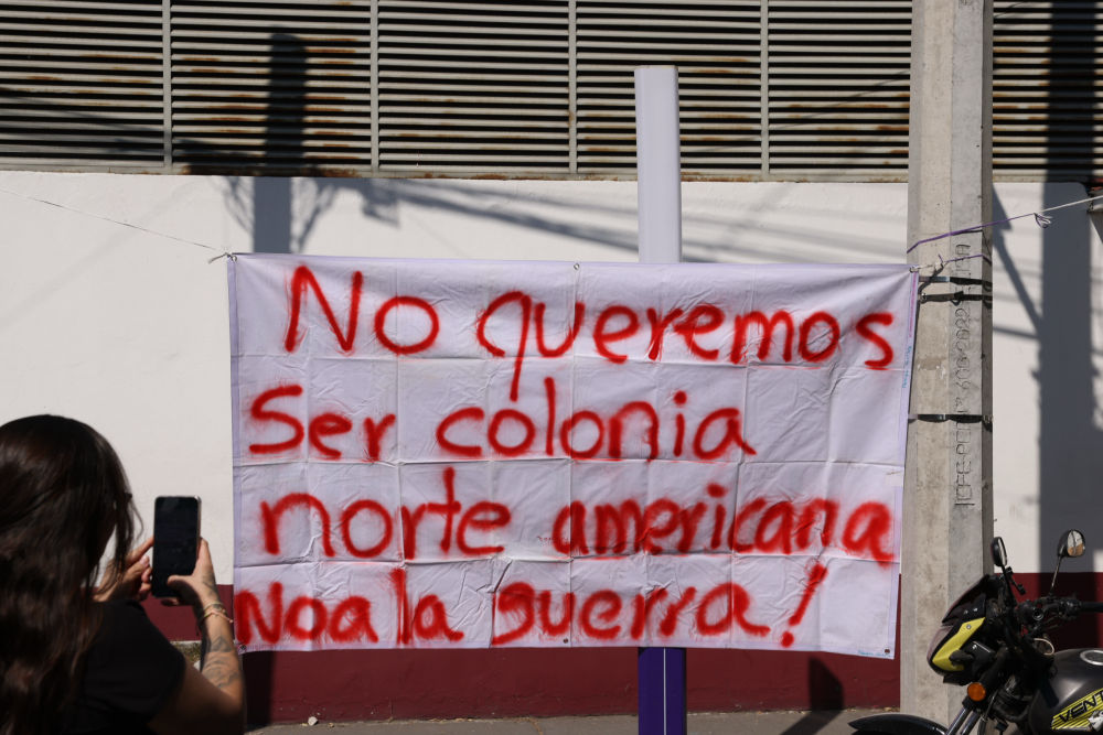 1月3日,在墨西哥首都墨西哥城美国驻墨西哥大使馆外,民众在抗议活动中打出标语“我们不想当北美殖民地,我们拒绝战争”。