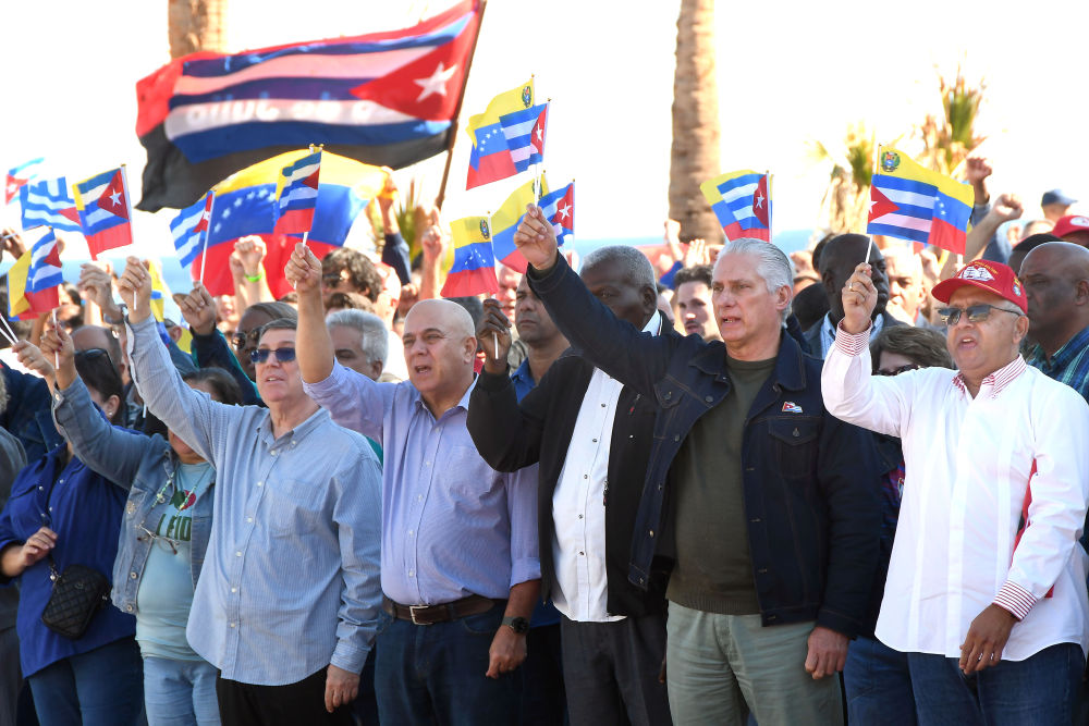 1月3日,在古巴首都哈瓦那,古巴国家主席迪亚斯-卡内尔(前右二)等领导人与民众参加大型集会,反对美国的军事行动。