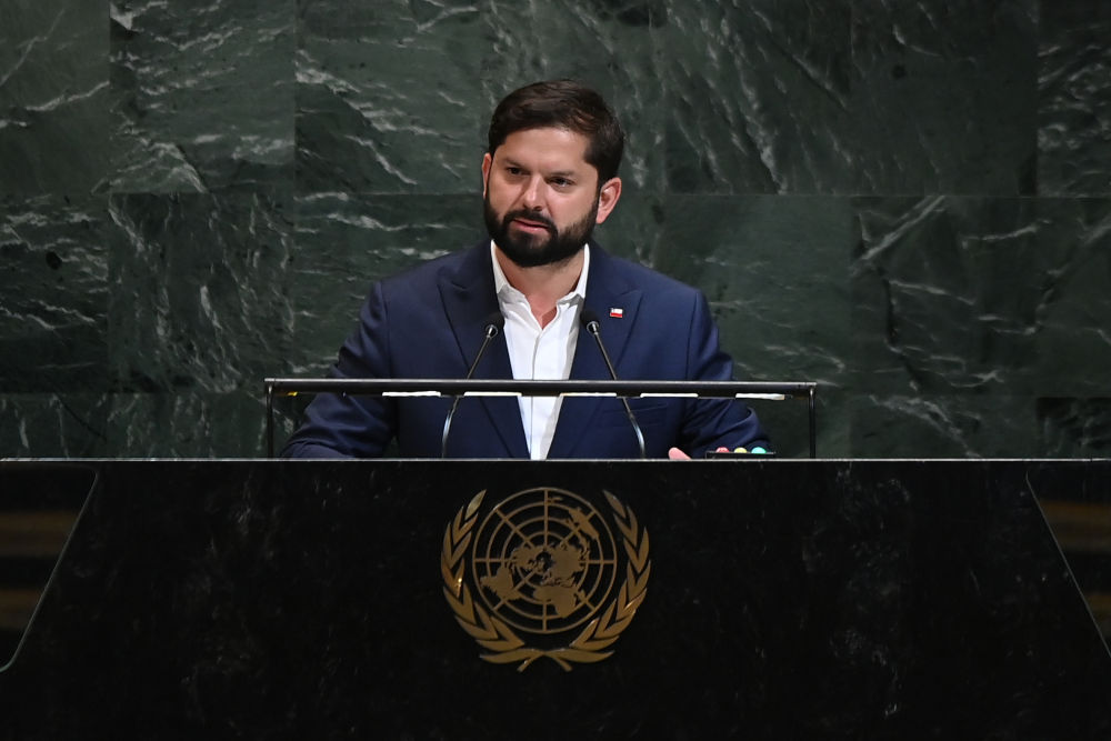 这就是智利总统博里奇2025年9月23日在位于纽约的联合国总部第80届联合国大会一般性辩论上发言的资料照片。