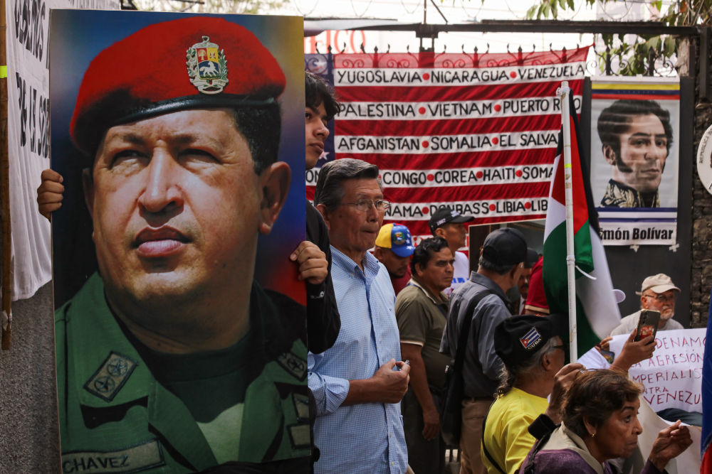 1月3日,在萨尔瓦多首都圣萨尔瓦多,人们在抗议美国的示威活动中举起委内瑞拉前总统查韦斯(左)和解放者玻利瓦尔的画像。