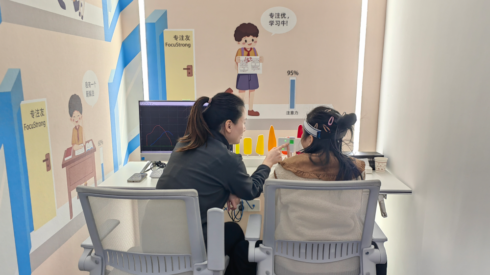 2024年2月,13岁的孤独症女孩朵朵(化名)第一次体验脑机接口训练。(受访者供图)