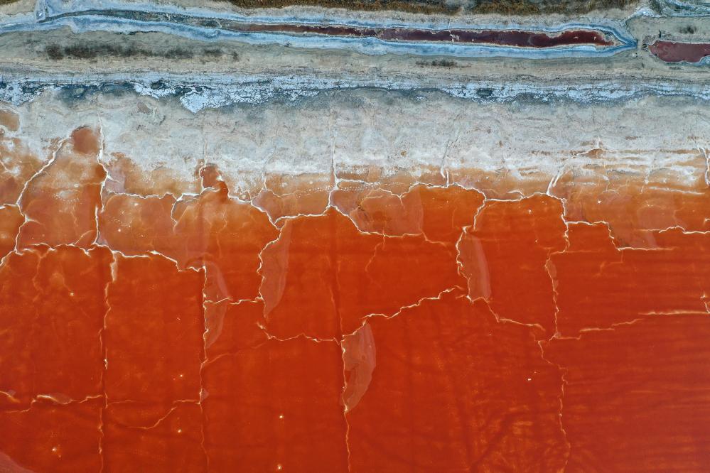 这是2025年5月20日拍摄的运城盐湖景色。连日来,随着气温持续升高,位于山西南部的运城盐湖呈现出色彩斑斓的景象,从空中俯瞰,如同一块块散落在大地上的调色盘。新华社记者 詹彦 摄