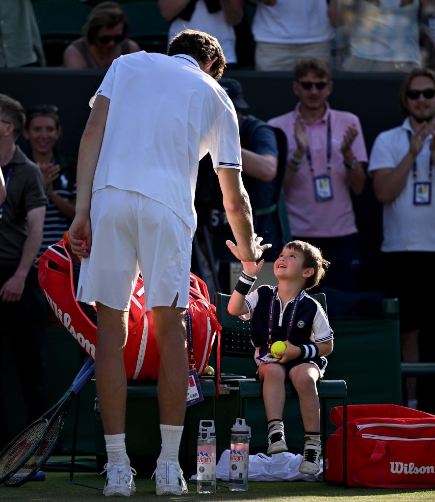 2025年7月4日,尼古拉斯·贾里(左)在获胜后与儿子击掌庆贺。当日,在英国伦敦举行的2025温布尔登网球公开赛男子单打第三轮比赛中,智利选手尼古拉斯·贾里3比1战胜巴西选手丰塞卡,晋级下一轮。新华社记者 李颖 摄