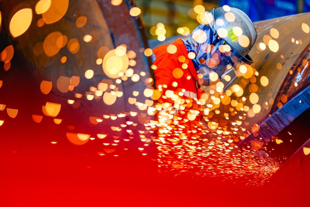 2025年10月1日,在天津市滨海新区,渤海油田工人进行打磨作业。新华社发(杜鹏辉 摄)